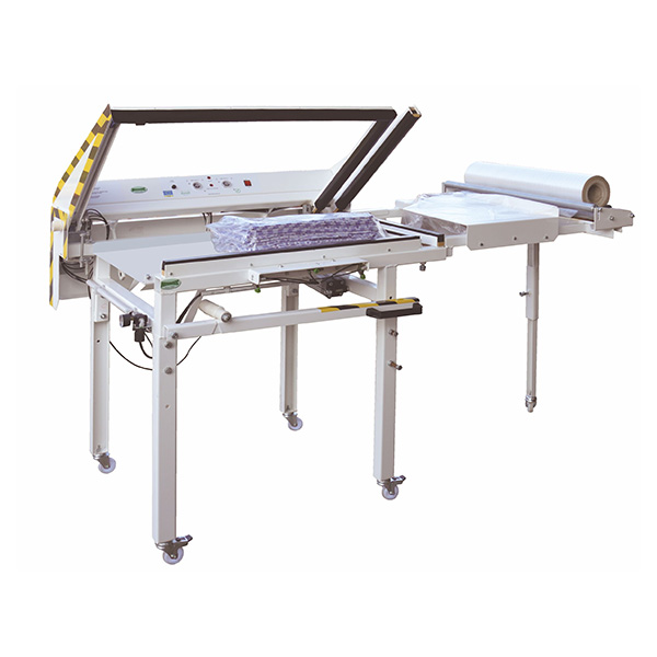 Embolsadora de soldadura en "L" (sella por los dos lados) para empaquetar ropa de lavandería. La doble soldadura garantiza un sellado más fuerte, lo que permite hacer paquetes más grandes (hasta 90 x 70 cm). Funcionamiento neumático del cuadro de sellado con dos pulsadores. Medida del cuadro de sellado: 90x70cm. Altura máxima del paquete: 50cm. Utiliza plástico en bobina de semitubo de anchura máxima 75cm. Requiere conexión a toma de aire comprimido (6bar).