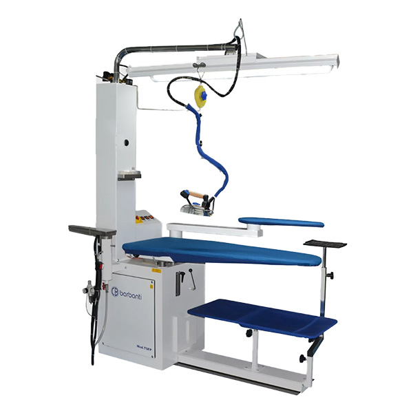 Mesa de planchado con plato aspirante y soplante con caldera de vapor de 5 litros incorporada. Plato standard de 138x50x28cm. Potencia de caldera: 3900W. Plato regulable en altura de 84 a 99cm con control neumático. Doble pedal para poder planchar por ambos lados. Carga de agua mediante bomba incorporada. Plancha de mano Due Effe Jolly. Tensión de alimentación: 400V. Esta mesa requiere conexión a compresor de aire.
